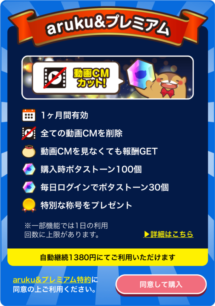 - aruku&プレミアム(月額1380円)加入でお得な特典がもらえる