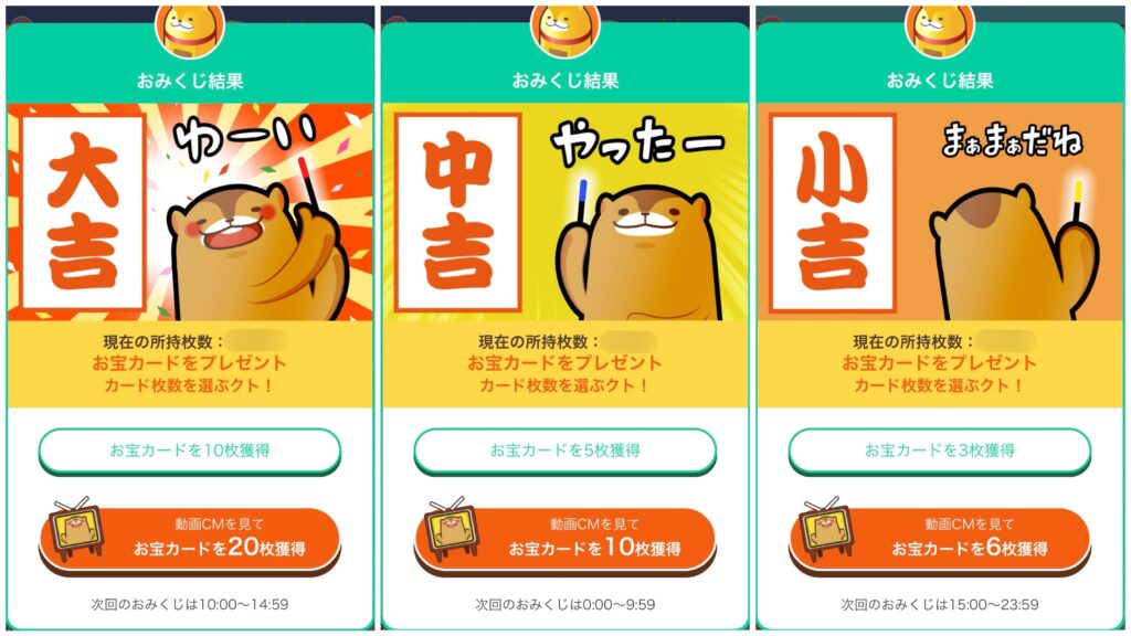 | 運勢 | 獲得カード枚数 | 動画視聴 |