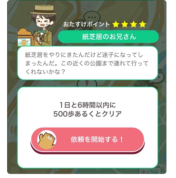 住民キャラクターの依頼を達成するなどゲーム感覚で楽しみながら健康づくりができ、現金や電子マネーへの交換も可能。